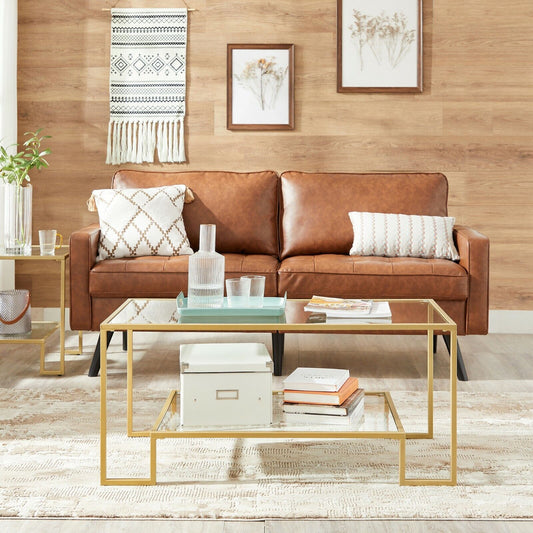 Mesa de centro con dos niveles para sala de estar o salón estilo vintage / contemporáneo - Sobre de vidrio y estructura metálica dorada